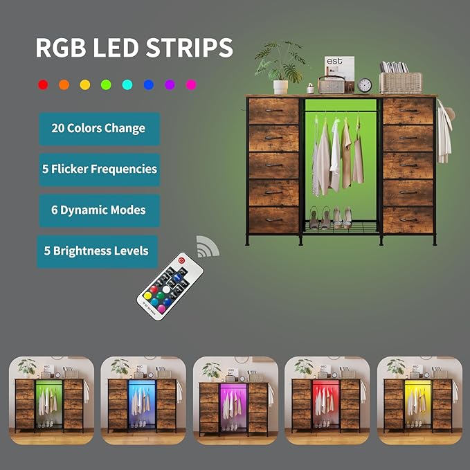 LUMTOK 55W 2-in-1 Dresser with Hanging Rack, 10 Drawers Dresser for Bedroom,Dressers with Fabric Drawers,LED Lights, Charging Station and Hanging Racks for Bedroom (Rustic Brown)
