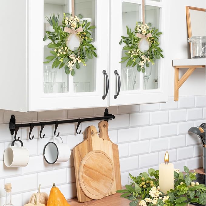 6 Pcs Green Eucalyptus Swag Wreaths for Pillars Spring Summer Kitchen Cabinet Wreaths Mini Green Berry Leaves Wreath with Ribbon for Front Door Porch Wall Window Farmhouse Decoration