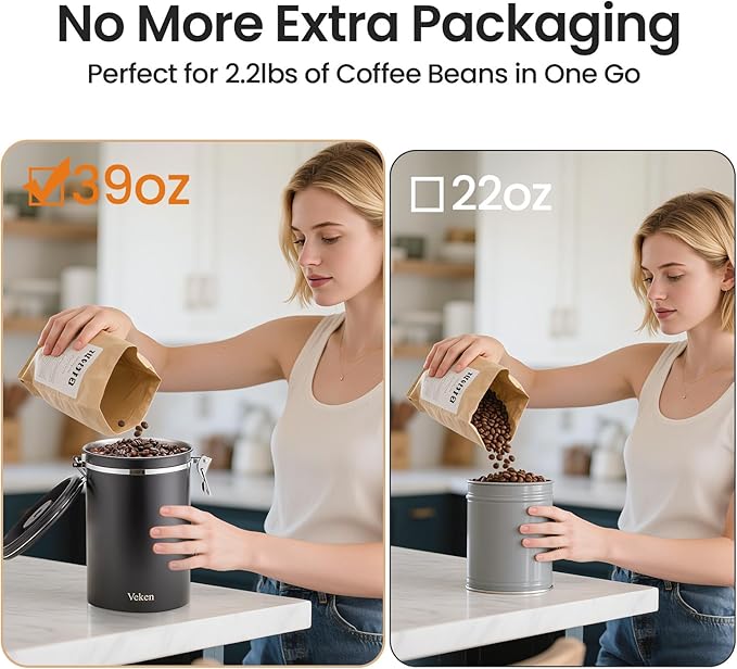 - 【Perfect for 2.2lbs Package Storage】This 39OZ coffee canister is specifically designed to accommodate 2.2lbs coffee beans storage. It eliminates the trouble of having to use clip - sealed secondary packaging for leftover beans due to insufficient capacity. For whole bean, hold a minimum of 35.5oz | 1.1kg | 2.2lbs common bag sizes found in the market. For ground, hold extra to 40oz | 1.13kg | 2.5lbs.