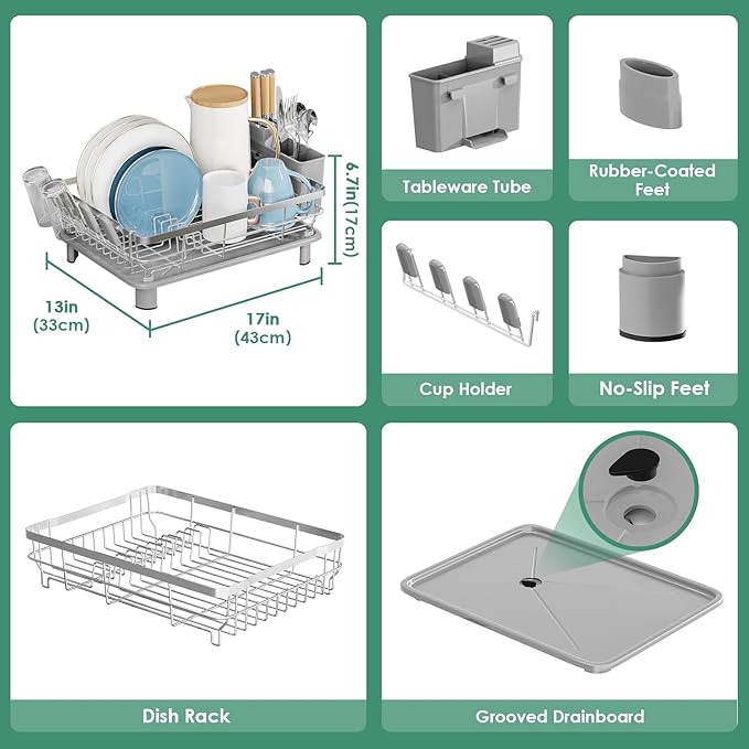MOUKABAL Dish Drying Rack - Stainless Steel Dish Rack, Dish Racks for Kitchen Counter, Drying Rack Kitchen with Removable Utensil Holder, Drainboard and Glass Organizer (Grey)