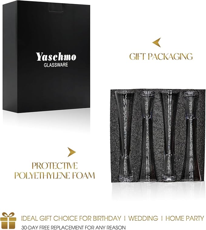 - 【Yaschmo 's Customer Service】Yaschmo champagne flutes set of 4, will bring exquisite products and our sincerity to your hands. We provide the perfect customer service and will reach out to you once received glass, make sure you have not any concern.Choose this luxury, unique gift to bring joy to friends and family, celebrating life’s simple pleasures together.