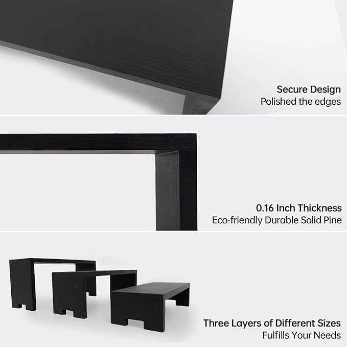 - 【Tierd Display Stands for Vendor】🎁: First they are no need any tools then can be used directly! very convenient to display more items for vendors, they are not only beatiful but also improve space utilization rate, U-shaped wood risers, fire-carbonized, durable, non-toxic, odorless, and no deformation, nested design for easy storage in living room,bedroom,kitchen,indoor,outdoor, also can be used individually or as a set.