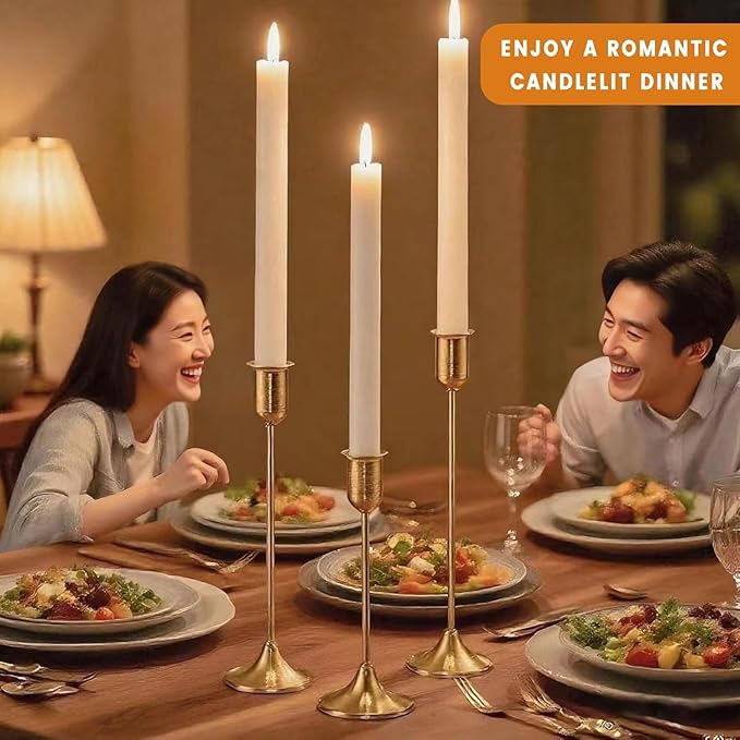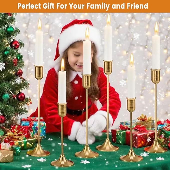 - ✅ Elegant 6-Piece Set: Set of 6 gold taper candle holders made from durable matte metal, designed to hold standard taper candles. Perfect for adding a modern, elegant touch to dining tables, mantels, coffee tables, weddings, dinner parties, or home decor settings. This gold candle holders set is suitable for candle sticks and taper candles, each one can fit 3/4 inch and 7/8 inch small candles as well as LED cone candles to match your dining table decor.