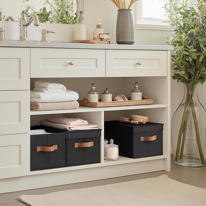 StorageWorks Large Storage Bins with Lids, Decorative Storage Boxes with Lid and PU Handles, Foldable Storage Baskets for Closet, Shelves, Stackable, Black, 3-Pack
