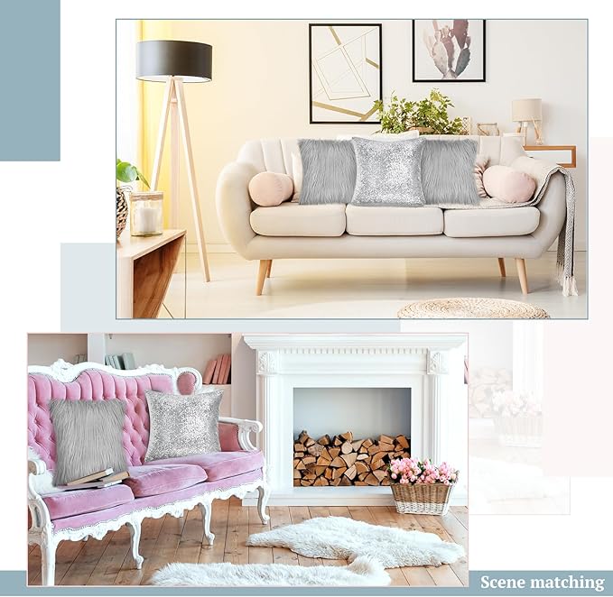 - Well made: the glitter decorative pillowcases are made of opaque sequin fabric, which is satin fabric embroidered with 3.0 mm shiny sequins, the sequins are also glitter and shiny; Faux fur throw pillow covers are made from polyester, soft and comfortable to touch, while possessing both decorative effect and practicability