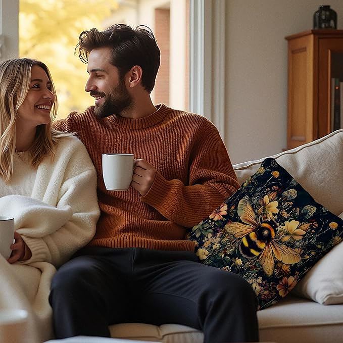 Vintage Moody Floral Bumblebee Pillow Covers 18x18, Moody Dark Cottagecore Botanical Wildflower Bee Decorative Throw Pillow Covers for Home Bedroom Living Room, Bee Decorations for Home