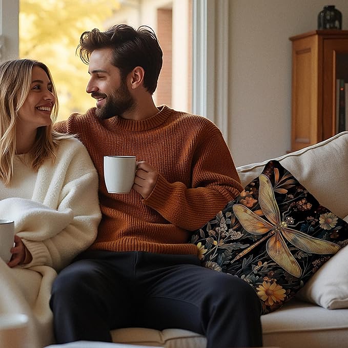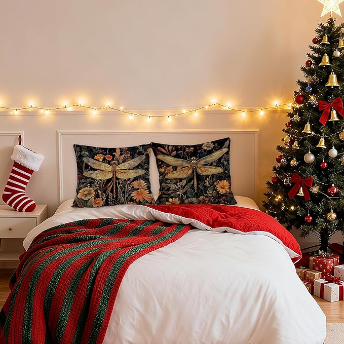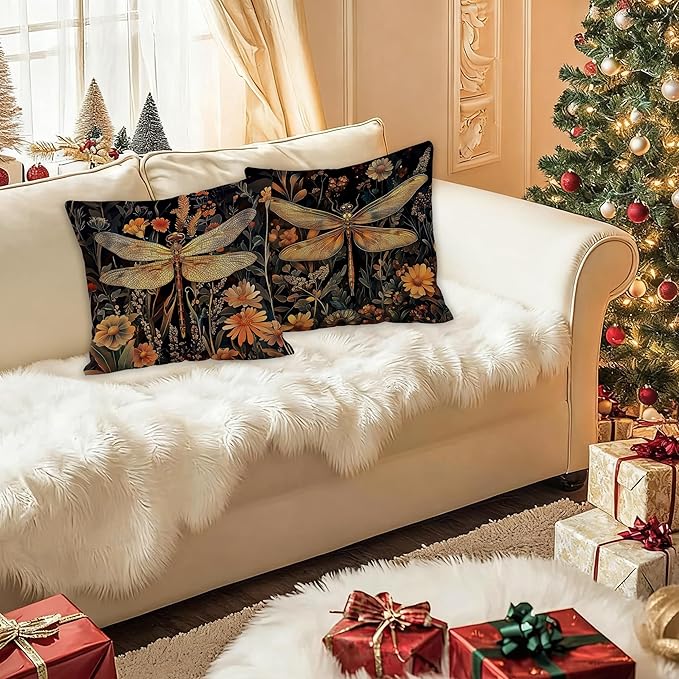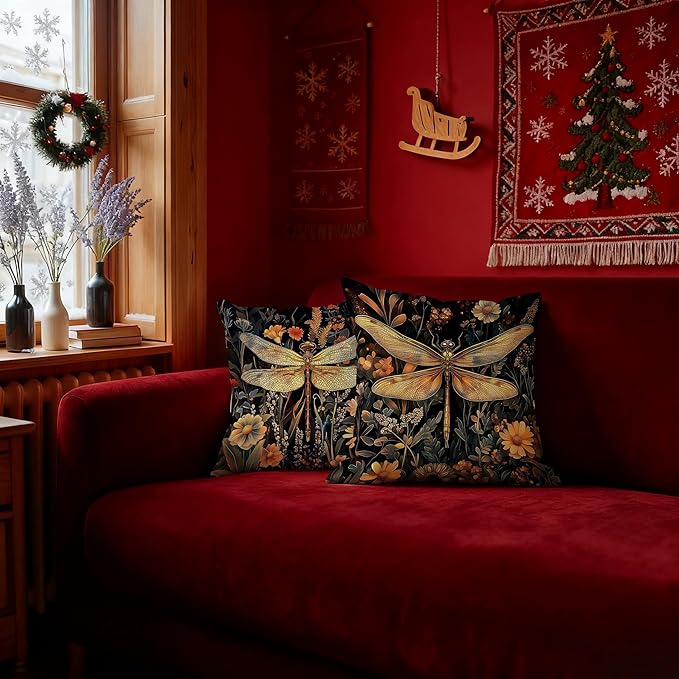 Vintage William Morris Inspired Dragonfly Pillow Covers 18x18, Dark Cottagecore Botanical Wildflower Decorative Throw Pillow Covers for Bedroom Living Room Home, Cottagecore Room Decor
