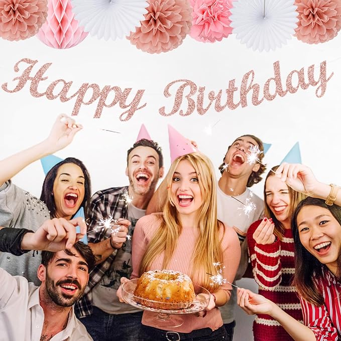 - 【Light pink rose gold birthday decorations kit includes】The party decorations kits include 8pcs light pink rose gold paper flower, 2pcs white paper fans,2pcs 8" white paper honeycomb, happy birthday garland and light pink rose gold streamers.