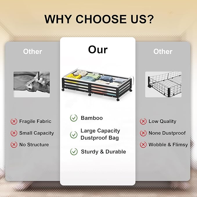 - 【360° Rotating Wheels】Features detachable wheels for easy sliding in and out from under the bed; convenient access in tight spaces