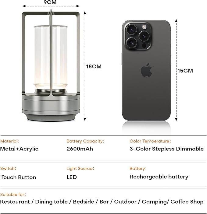 - đź’š [ A perfect gift idea ]: Our touch light lamp can match a variety of scenes and styles while making a great gift. It can be used as an ambient light for Thanksgiving, Christmas and birthday parties. The rechargeable cordless led table lamp is suitable for bedroom, bedside table, office, restaurant, cafe, bar, hotel, outdoor patio lighting, etc.