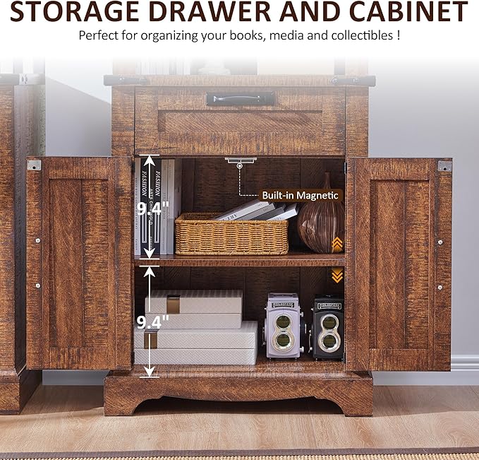 - Large Storage Space: This bookcase with drawer feature with 5 spacious adjustable shelves , 1 drawers and a colsed cabinet with barn door design, providing ample storage for all your books and decor items. Dimensions: 71.4"H x 23.6"W x 11.8"D. Whether in your living room, bedroom, or home office, this white bookshelf with a versatile storage cabinet is the perfect addition to your space