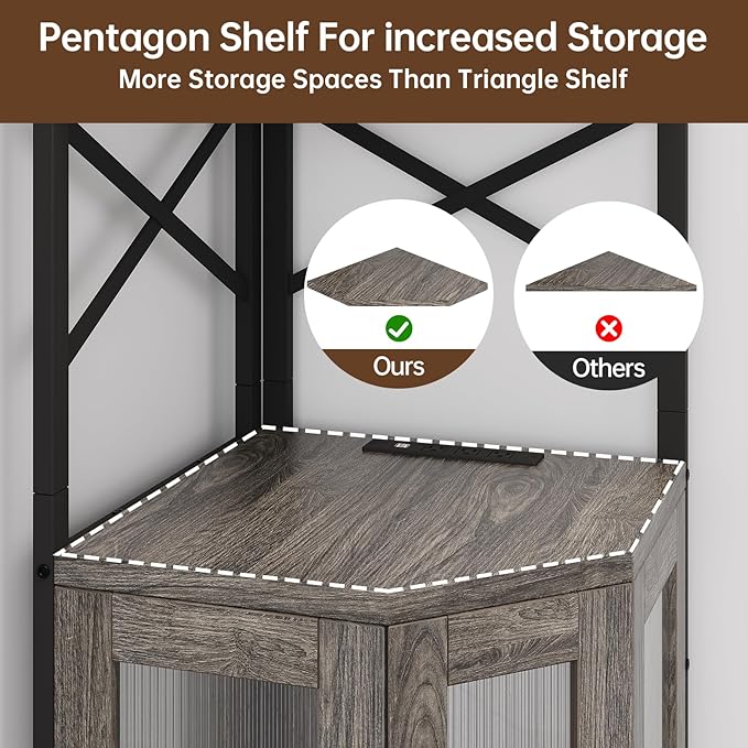 Corner Bar Cabinet with Power Outlet, 5-Tier Corner Wine Cabinet with Led Strip and Glass Holder, Industrial Tall Liquor Cabinet Bar Wine Rack for Home, Grey Oak