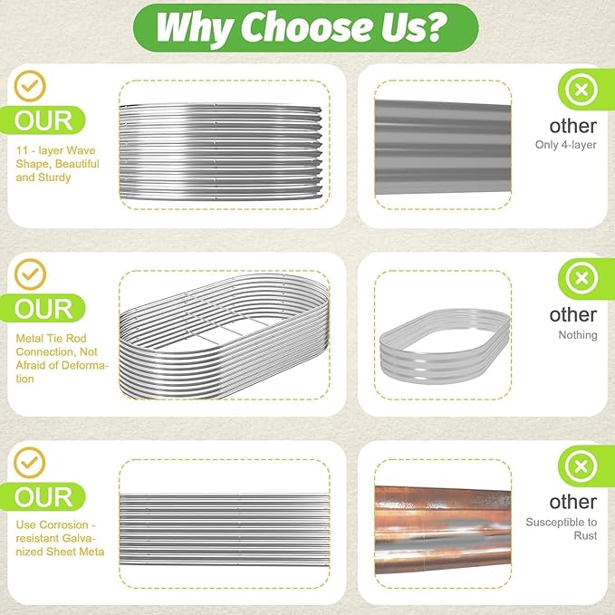 - Durable material: This raised bed is made of galvanized steel with a wavy structure that is stable and can withstand daily wear and tear. Long service life, can be exposed to sunlight, rain and snow for a long time, suitable for various climatic conditions.