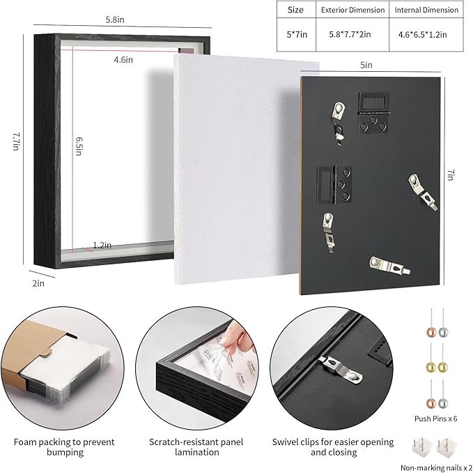 - 【Shadow Box Size】This 5×7 in black shadow box frame (includes 2 non-marking studs + 6 decorative pins) measures 5.8×7.7 inches on the outside and 2 inches in depth on the outside. The internal display size is 4.6×6.5 inches with an internal depth of 1.2 inches.