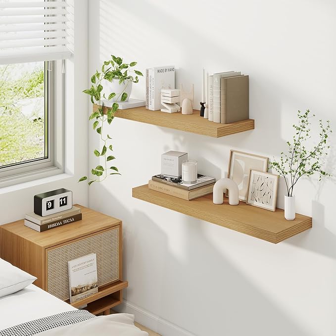 - Timeless Design for Any Room: Elevate your décor effortlessly! The classic retro texture of these floating shelves complements bathroom, bedroom, kitchen, living room or even office space. Neutral tones blend with existing furniture, adding warmth without clashing