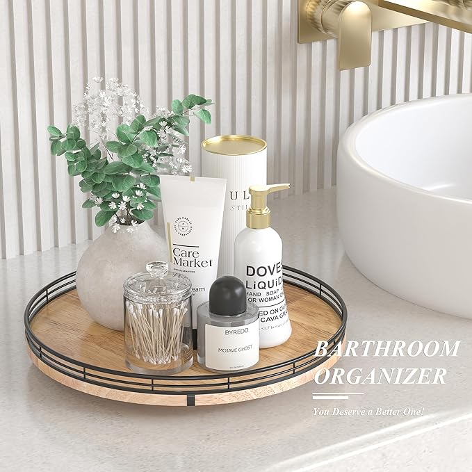 - UPDATED DESIGN: With larger wood base on this lazy Susan for table top, the turntable organizer doesn't wobble, even with heavier items on it. With premium oak wood and classical iron fence make this lazy Susan turntable stylish, functional and adding a touch of rustic charm. it’s also very easy to clean. There are included anti-slip pads on the bottom of the lazy Susan for extra surface protection.
