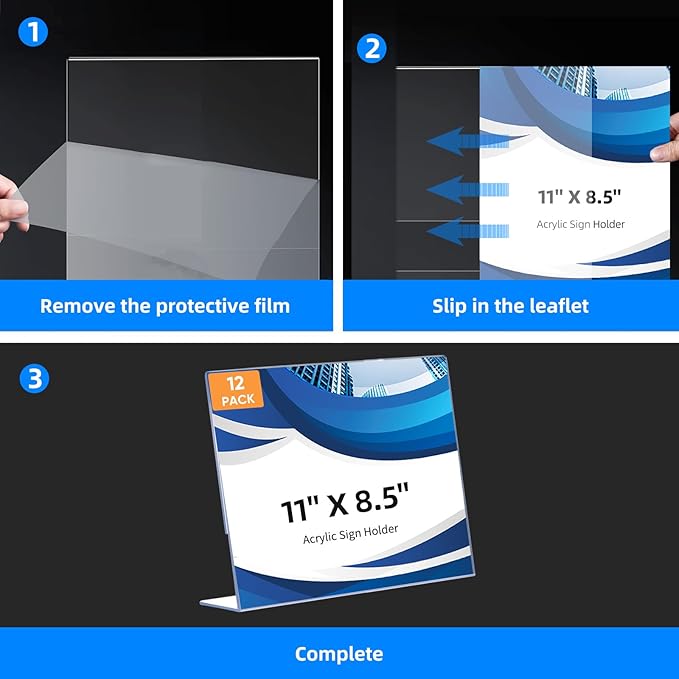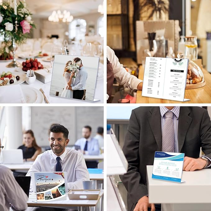 - 6 Pack Durable 11x8.5 Plastic Sign Holders: Designed with a slanted back and L shape base, these sign holders securely display flyers, menus, and documents in high-traffic areas. The anti-slip silicone pads ensure stability on countertops or desks, preventing slips even during busy hours. Perfect for restaurants, retail stores, offices, and events.