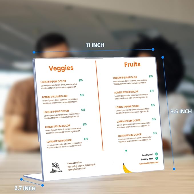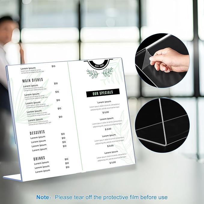 - L-Shaped Slanted Back Design for Optimal Visibility: The angled display (15° tilt) enhances readability, directing customer attention effortlessly. Made from clear acrylic, the holders resist yellowing and scratches, maintaining a professional appearance. Ideal for promotions, pricing signs, or daily specials.