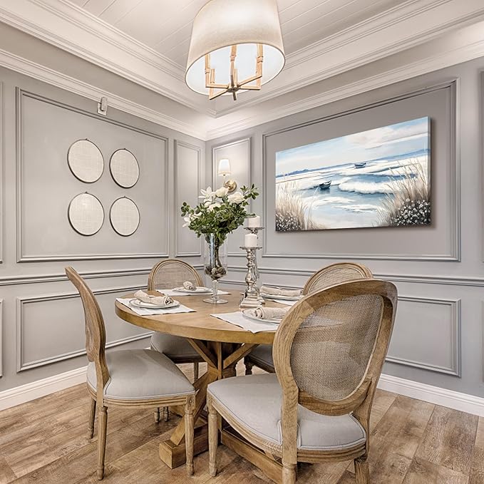 - ➤Tranquil Wall Art for Every Space. Transform your walls with this large stunning coastal canvas art featuring a serene seaside view, gentle waves, and two peaceful boats under a calming sky. Perfect for adding nature-inspired elegance to your bathroom, kitchen, bedroom, or office décor