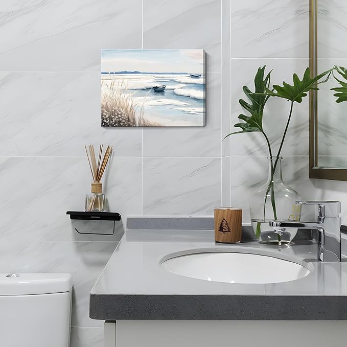 amatop Coastal Wall Art - Nautical Ocean Canvas Print with Light Blue & White Seascape, Boat, Reeds - Beach Picture for Modern Farmhouse, Lake House, Bedroom, Bathroom, Beach-Themed Artwork,16x12