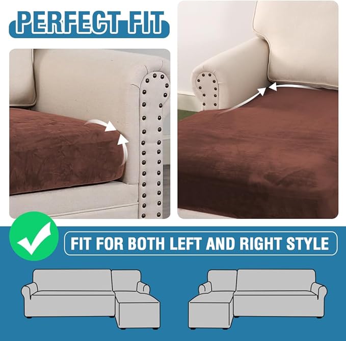 - INCREDIBLY COMFORTABLE VELVET: Products passed GLOBAL RECYCLED STANDARD certificate.This innovated stretch sofa slipcovers are constructed with 4 PIECES,including 1 Chaise cover and 3 individual cushion covers. Crafted from luxurious velvet plush fabric, feature thick, soft, smooth, anti-wrinkle, no fading, durable as well as highly stretch. Protect your cushion furniture from daily wears and tears, stains, kids, scratches from pet claws, dogs or accidental spills