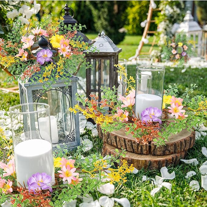 6 Pcs Spring Summer Hanging Flower Swags Wreaths Mini Artificial Wild Flower Wreath Artificial Candle Rings Wreaths for Pillar Front Door Porch Wall Window Farmhouse All Seasons Decoration