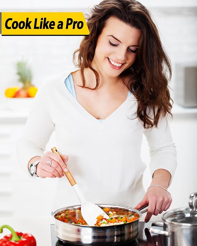 Pack of 4 Silicone Cooking Utensils Set, Non Stick Solid Spatulas and Heat Resistant Slotted Spoons with Wooden Handle, Ideal Wood Kitchen Utensils Set for Frying,Serving,Turning,Stirring (WHITE)