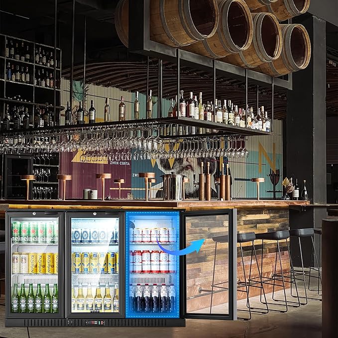 - [Automatic Defogging System] BODEGACOOLER 3 doors display Commercial bar fridge with a high definition double-layer Tempered glass door design, which provides better heat preservation and durability compared to traditional display bar fridge with a ordinary single-layer glass door. Also, this display beverage fridge with a built-in automatic defogging system that automatically removes fog from the glass every 6 hours, keeping the glass door of the display cabinet always clear!