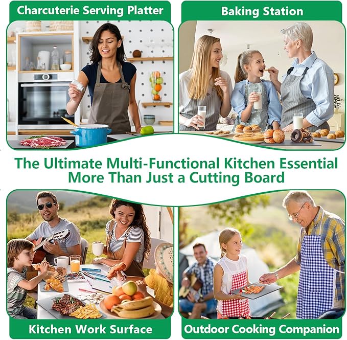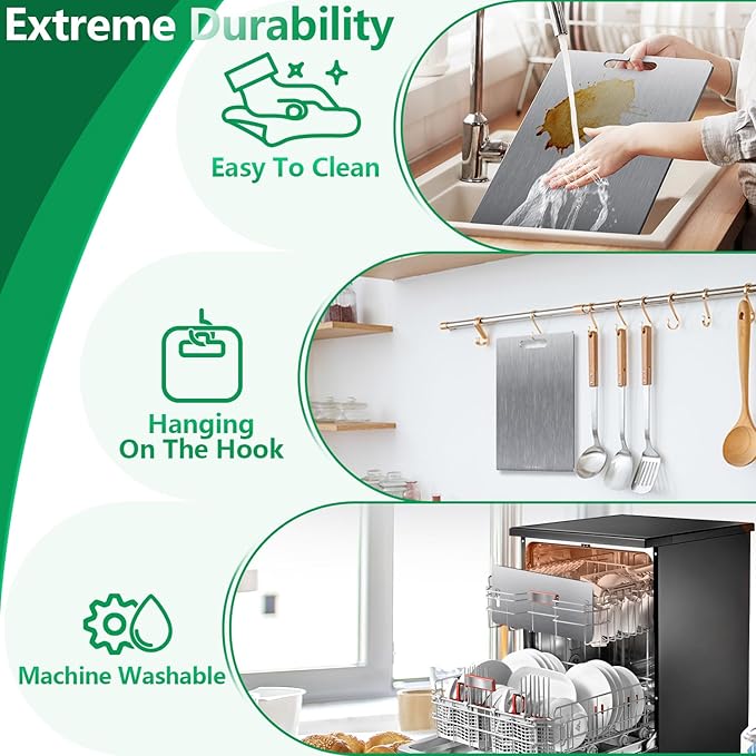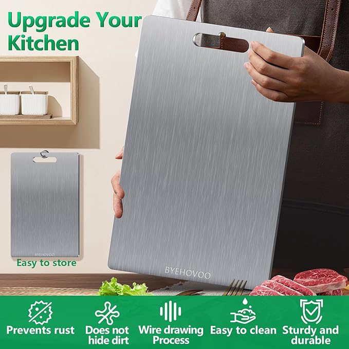 - 【Effortless Cleaning & Maintenance】 No oiling or soaking needed!Simply rinse with clear water.Dishwasher-safe (top rack recommended) for ultimate convenience.Food-grade titanium cutting boards are safe,do not release any crumbs,creating a healthy cooking environment.Titanium cutting board is the innovative choice of high-end kitchen tools,can be used for a lifetime.