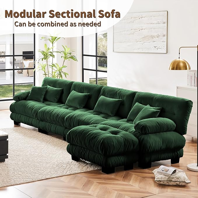 Modular Sectional Sofa, Comfy Cloud Couch 3 Seater Couch with Ottoman, Sectional Couches for Living Room, Modern Chenille L Shaped Couches, Sleeper Deep Seat Sofa with Throw Pillows, Green