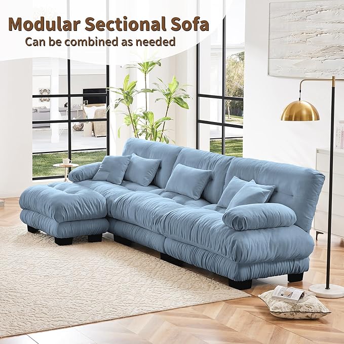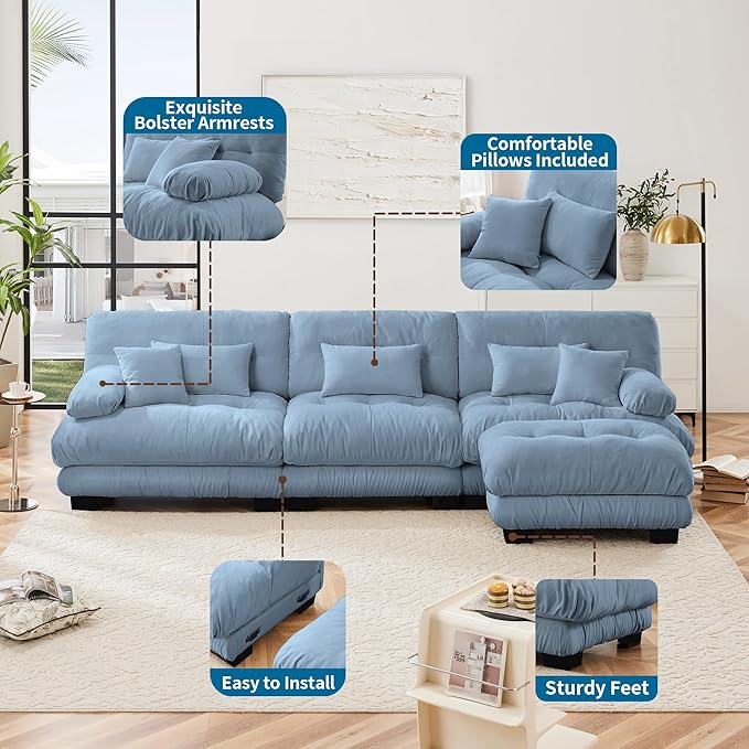 Modular Sectional Sofa, Comfy Cloud Couch 3 Seater Couch with Ottoman, Sectional Couches for Living Room, Modern Chenille L Shaped Couches, Sleeper Deep Seat Sofa with Throw Pillows, Blue