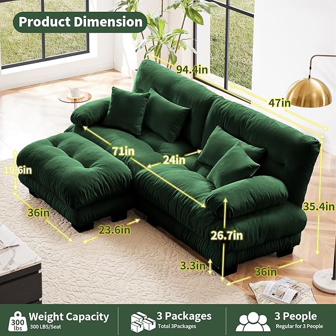 Modular Sectional Sofa, Comfy Cloud Couch Oversized Loveseat with Ottoman, Sectional Couches for Living Room, Modern Chenille L Shaped Couch, Sleeper Deep Seat Sofa with Throw Pillows, Green