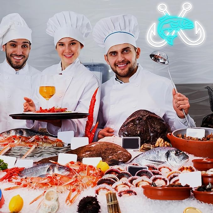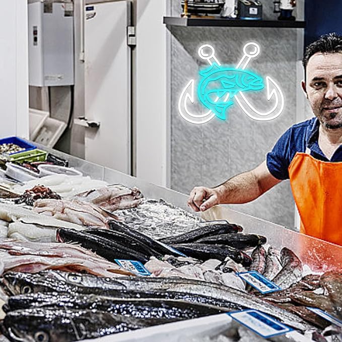 - Fishing neon sign: The crossed fish hook pattern symbolizes fishing activities and is a familiar symbol for fishing enthusiasts. The fishhook and fish are in white and ice blue, adding visual impact. This fish on neon light sign can be used for fishing, Marine activities or seafard-related themes.
