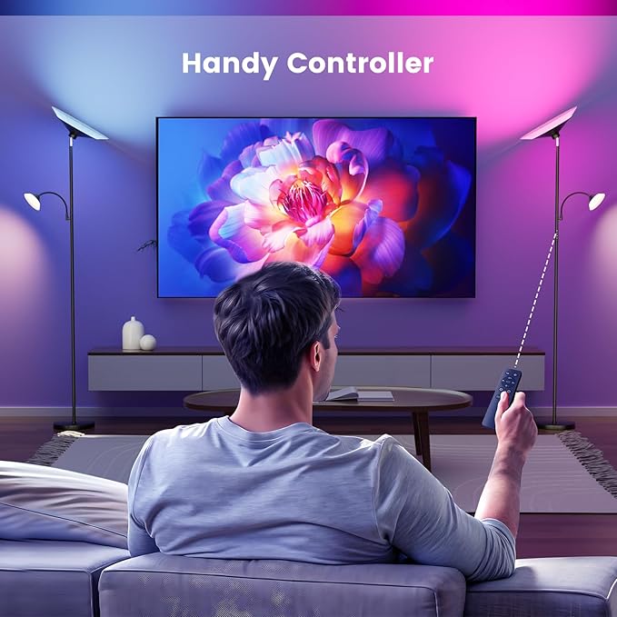 - 【Dual-Zone Lighting】This upgraded RGB torchiere floor lamp, adjust brightness (10%-100%) and color temperature (3000K-6500K), the warm light & RGB color creates cozy ambiance for movie nights or relaxation, the natural light provides flicker-free illumination for reading/working.