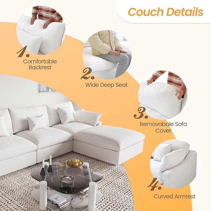 JACH U Shaped Sectional Couches, Cloud Sectional Couch with Deep Seat, 119" Down Filled Modular Sofa with Chaise, Covers Removeable & Washable, Sofas Furniture for Living Room, White