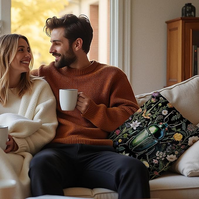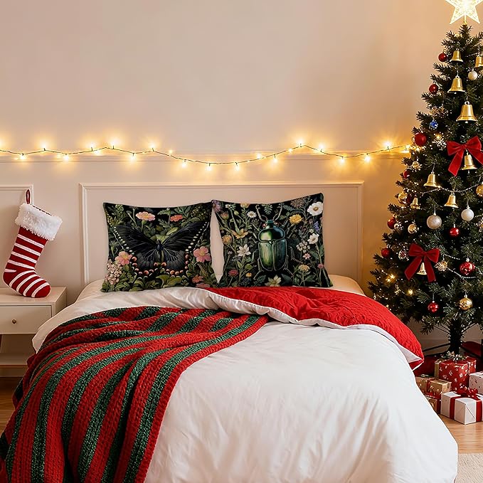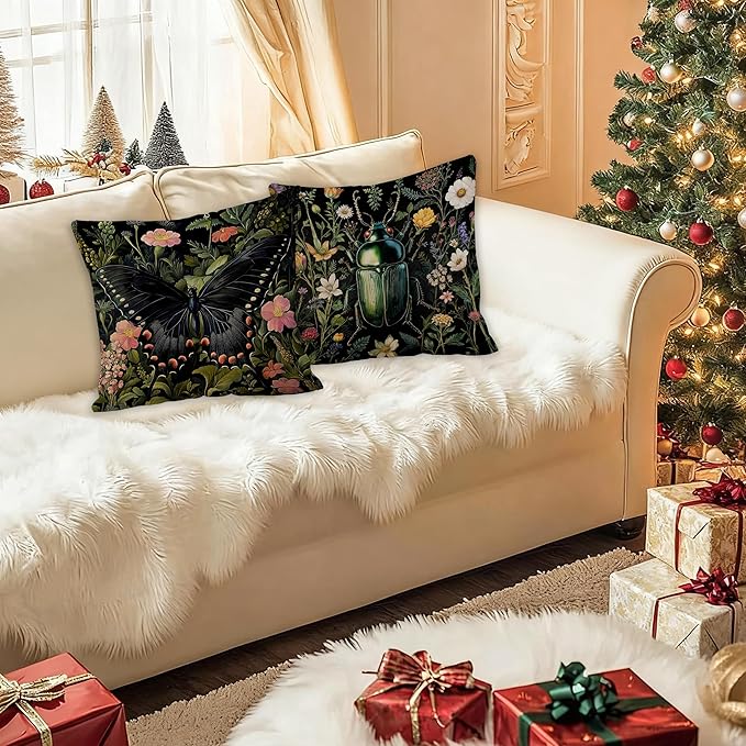 William Morris Inspired Butterfly and Beetle Pillow Covers 18x18 Set of 2, Dark Cottagecore Wildflower Botanical Insect Moth Decorative Throw Pillow Covers for Home Bedroom Living Room