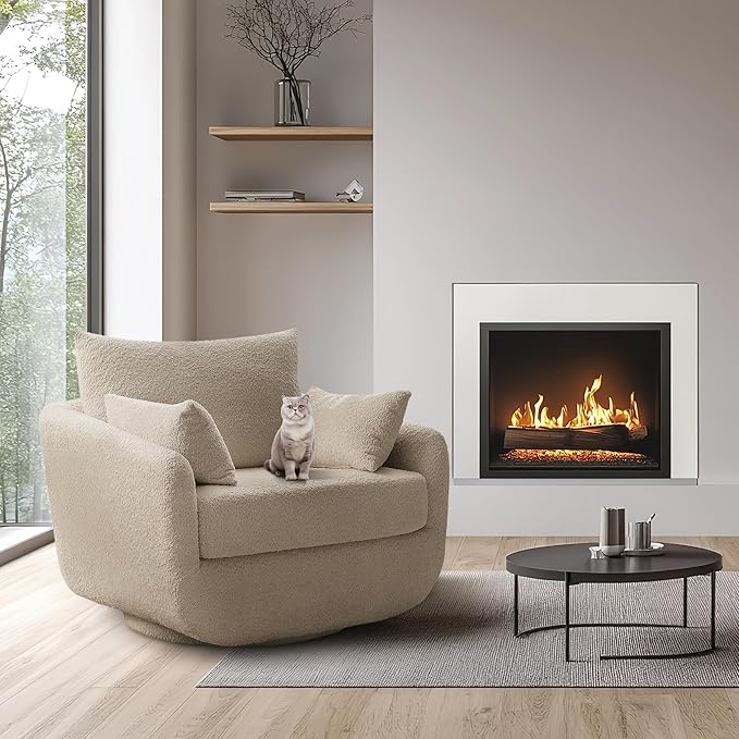 - Durable Construction & Floor-Friendly Design---Built to last with a 360° solid wood swivel base (supports 330 lbs) and reinforced steel frame,No wobbling, squeaking, or sudden drops,just silent, stable rotation perfect for conversations,With its swivel base, the chair can rotate fully,maximizing space utilization in smaller rooms.The wood he base is wrapped with black anti-dirty gaske also protects hardwood floors from scratches.