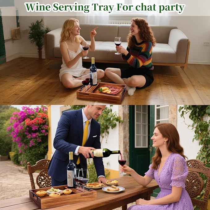- Serving Tray with Metal Handle & Removable Stemmed Wine Glass Holder: Enjoy your favorite wine without worrying about spills! The convenient stemware holder of wooden tray securely cradles your glass and easily detaches for cleaning or when not needed. Paired with a sleek and durable metal handle of ottoman tray for easy movement.