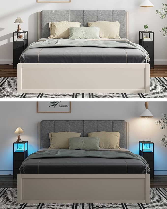TUTOTAK Narrow LED Night Stand with Charging Station, Slim End Table with Plugins, Tall Side Table with 3 Fabric Drawer, Small Bedside Table with Storage, for Living Room, Black TB01BK086L