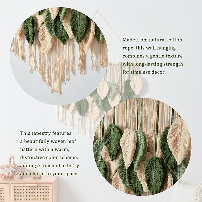 - 【Boho Leaf Design】- Macrame wall decor features intricately woven green and white cotton woven leaves, creating a natural boho home vibe. Elevate your space with our bohemian-style macrame leaf wall hanging