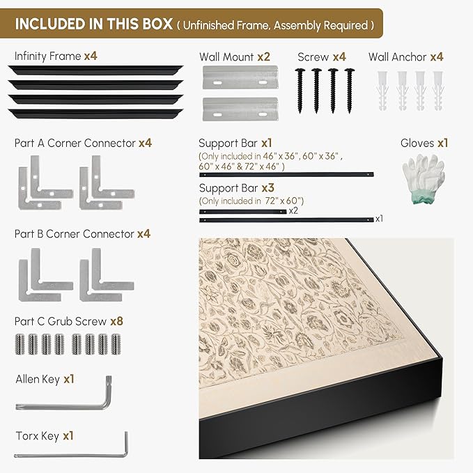 - Assembly Required: The artwork comes with the frame components unassembled. Don’t worry — setup is straightforward and tool-friendly. For best results and accurate alignment, we recommend two people to ensure a smooth assembly and a stable, secure wall mount.