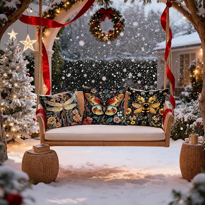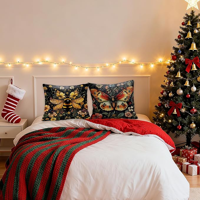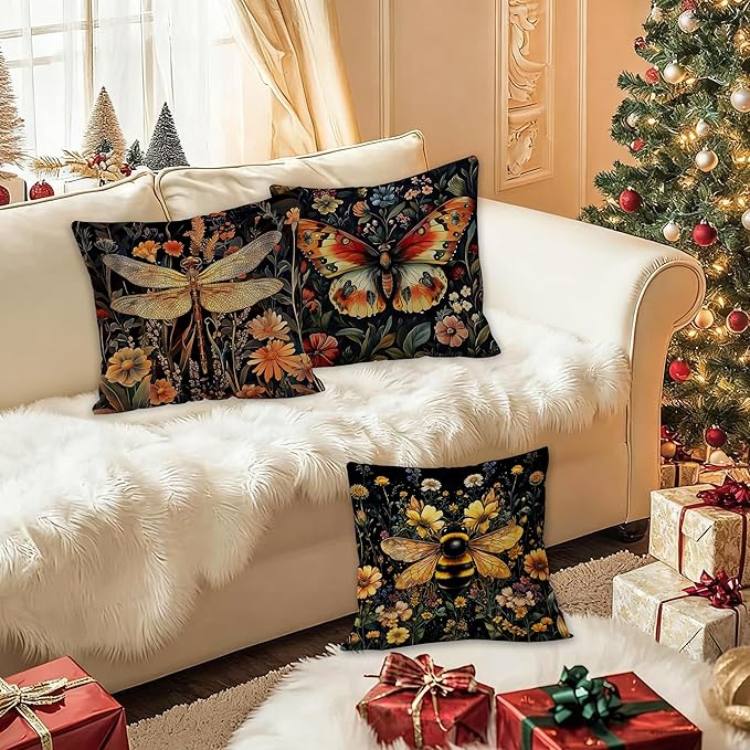 Vintage Dark Dragonfly Bee Butterfly Pillow Covers 18x18 Double-Sided Set of 3,Insect Gifts for Women,Vintage Dark Cottagecore Floral Botanical Insects Decorative Throw Pillow Covers for Home
