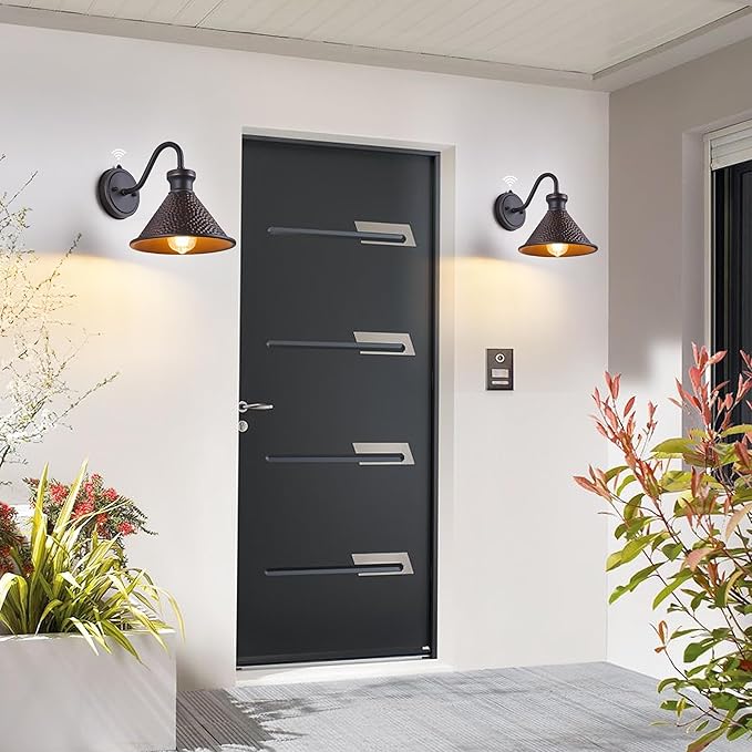 - 【Dusk to Dawn Photocell Sensors】: Our 2 sets of dusk to dawn outdoor lights utilize advanced dusk to dawn sensors that can sensitively detect the surrounding brightness and automatically turn on at dusk and off at dawn. They are energy efficient wall sconces that save you electricity and provide easy on/off access to outdoor wall lights. This classic never outdoor outdated outdoor wall sconce will simplify your daily life.