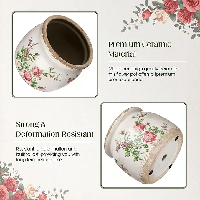 - Vintage Flower Pot: you will get 1 beige ceramic planter, which crafted with a distressed scroll shaped and French rose pattern, adding a rustic farmhouse vibe to both modern and traditional decor styles; Note: plants not included