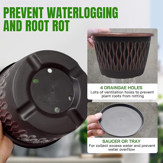 - 【Drainage System & Saucer】Each pot features multiple bottom drainage holes paired with a leak-proof saucer, preventing root rot while maintaining optimal moisture. Excess water drains quickly, while the saucer catches runoff to keep floors clean and retain humidity.