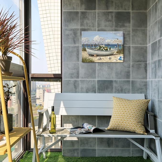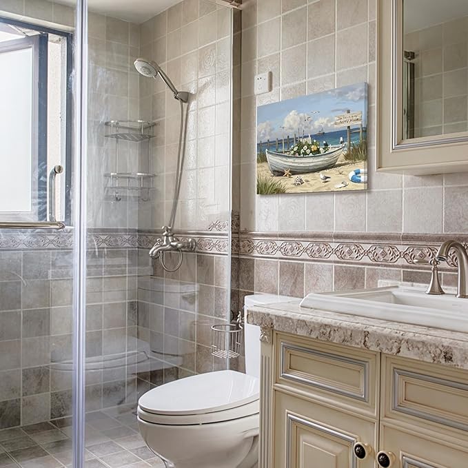 - Coastal Serenity for Your Space: Bring the tranquil beauty of the seaside into your home with this 16x12 inch beach wall art. Featuring a peaceful boat resting on the sandy shore, surrounded by gentle ocean waves, blooming coastal flowers, delicate seashells, and soaring seabirds, it adds a soothing, coastal charm to any room — from bathroom to bedroom, hallway to beach house.