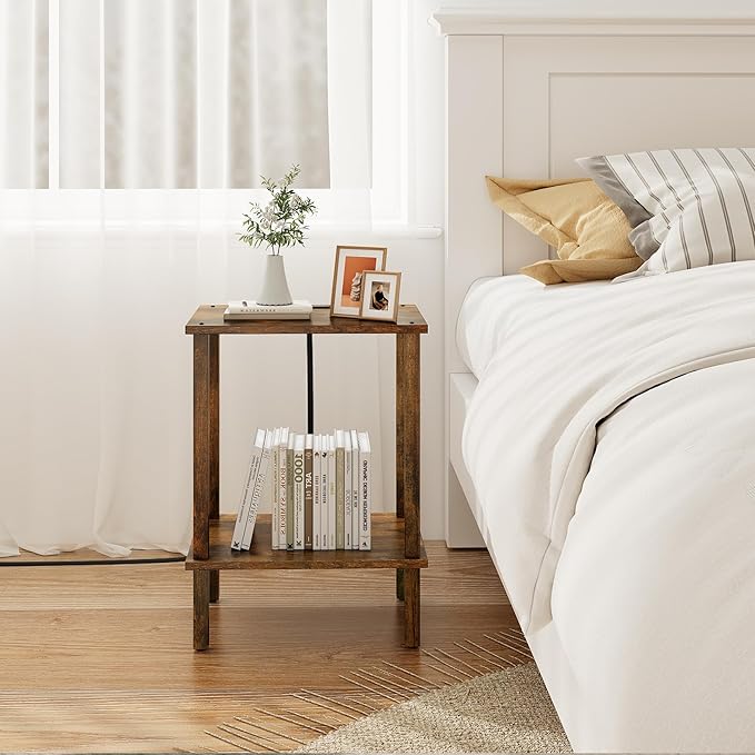 TUTOTAK End Table with Charging Station, Small Side Table with Outlets, Nightstand Bedside Table, 2-Tier Storage Shelf for Small Space, Living Room, Bedroom, Brown TB01BB040C
