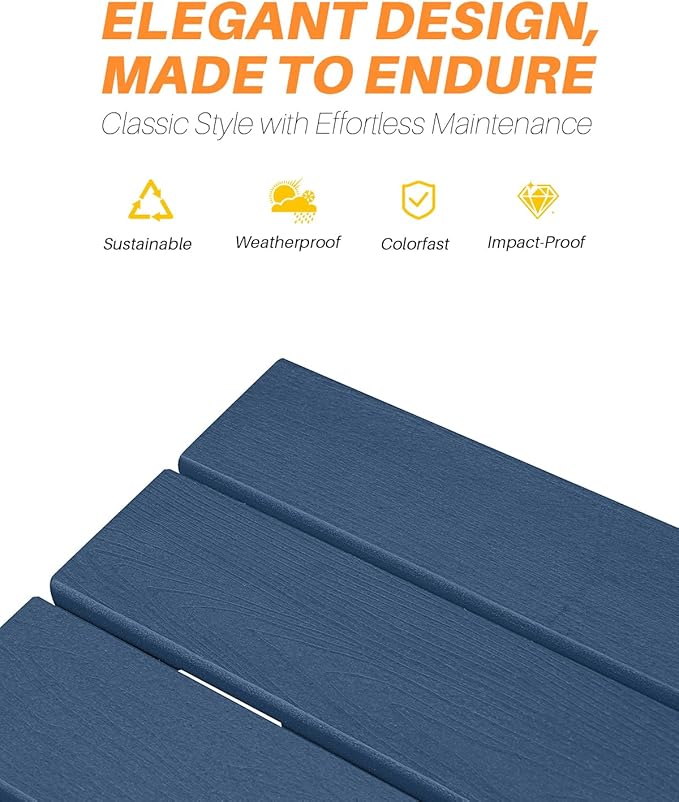 - All-Weather HDPE: Crafted from military-grade HDPE with lifelike 3D wood grain, this navy patio dining table is waterproof, UV-resistant, and won’t crack or fade, ensuring long-lasting beauty indoors or outdoors. The food-safe surface lets you serve meals worry-free, while the realistic wood texture elevates decks, balconies, and dining rooms alike.