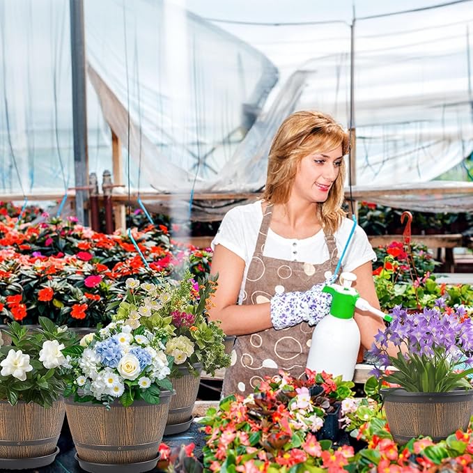 - 【Imitation Whiskey Barrel Design】These 10 inch planters for outdoor plants are designed with imitation wine barrel with rustic touch, which complements many different decorative styles. Planting with these plastic flower pots in your garden or front yard, not only make you feel peaceful rustic comfort, but also adds a touch of sophistication to indoor or outdoor spaces.
