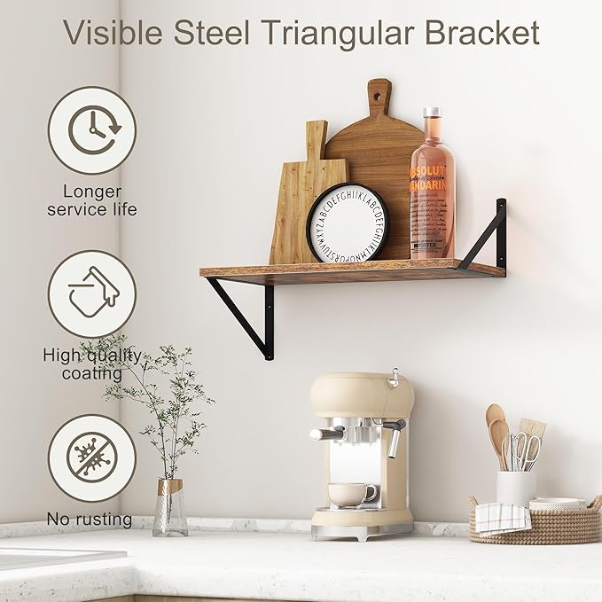 - 【FARMHOUSE RUSTIC WALL SHELF】These floating shelves are made of premium engineered wood board and visible triangular bracket. The rustic wooden grain surface add character and warmth to any modern or traditional interior with these deep floating shelves, contrast shelves at staggering heights on the wall or mount side-by-side or in the corner for a clean streamlined look.